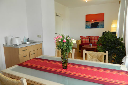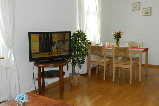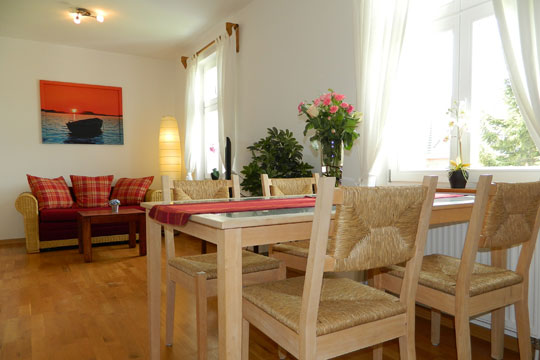 Wohnfläche ca. 35 m² für max. 2 Personen. Wohnbereich mit ausziehbarer Couch, Couchtisch, Flat-TV 32“, Esstisch mit 4 Stühlen.