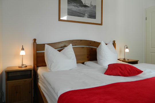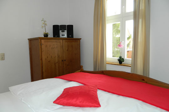 1 Schlafzimmer mit Doppelbett (180 x 200 cm), Nachttischen und großer Kommode sowie CD-Radio-Anlage.