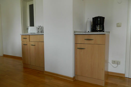 Im Wohnraum integrierte einfach ausgestattete Miniküche mit: 2-Zonen-Ceran-Kochfeld, großem Kühlschrank ohne Frostfach und Spüle, Toaster, Kaffeemaschine, Wasserkocher und Küchenutensilien.