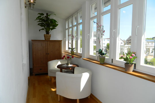 Kleiner, lichtdurchfluteter Wohnbereich mit Eßecke und 2 Loungesesseln