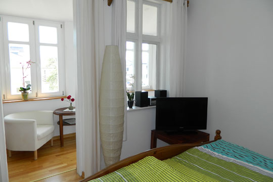 Offenes Schlafzimmer mit 32“ Flachbildschirm, Musikanlage, Doppelbett