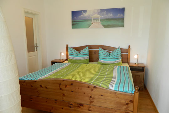1 offenes Schlafzimmer mit Doppelbett (180 x 200 cm), Nachttischen und Flat-TV 32“ sowie CD-Radio-Anlage.