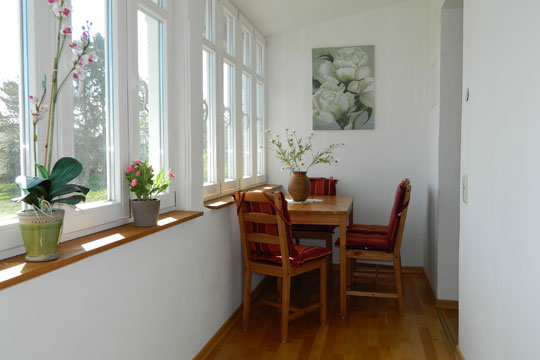 Wohnbereich in Form einer Veranda mit kleinem Tisch und 2 Lounge-Sesseln, großer Kommode sowie Esstisch mit 4 Stühlen.