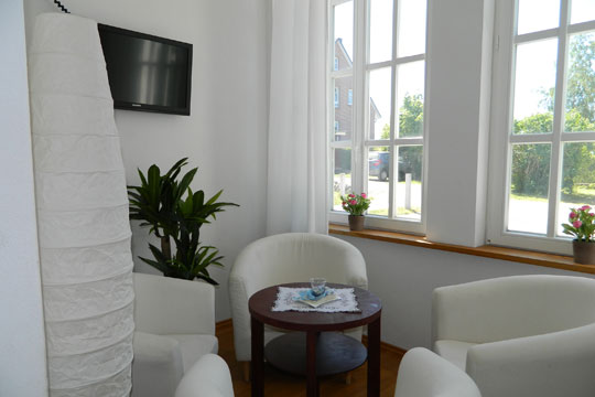 Wohnbereich mit Couchtisch, 4 Lounge-Sesseln und Flat-TV 32“ im lichtdurchfluteten Erker, Esstisch mit 4 Stühlen und Anrichte mit CD-Radio-Anlage.