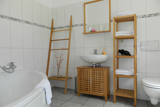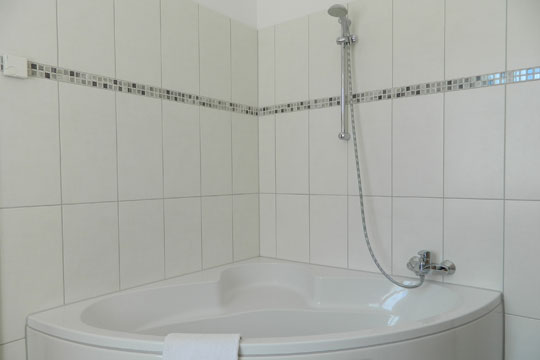 1 Bad mit Eckbadewanne, WC und Fön sowie Fußbodenheizung.