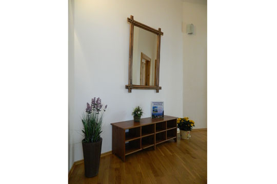 Wohnfläche ca. 70 m² für max. 4 Personen. Eingangsbereich mit Schuhkommode und Spiegel.