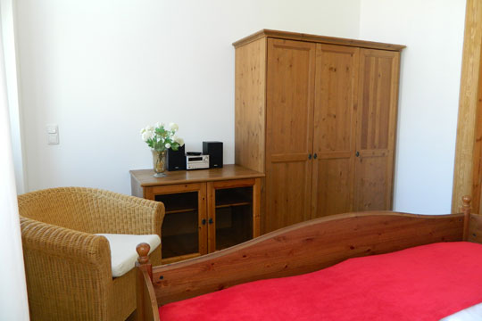 1 Schlafzimmer mit Doppelbett (180 x 200 cm), Nachtischen, großem Kleiderschrank und kleiner Kommode sowie CD-Radio-Anlage.